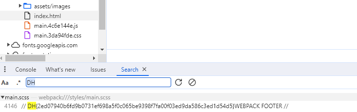 - Ctrl + Shift + F(전체 페이지 검색)에 DH를 입력하면 css 파일에 flag 값이 있음을 알 수 있다.
