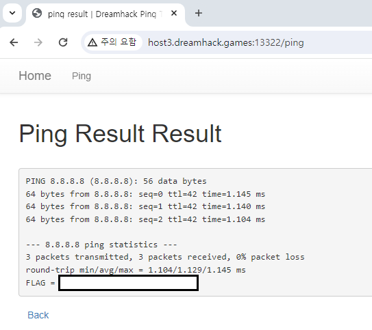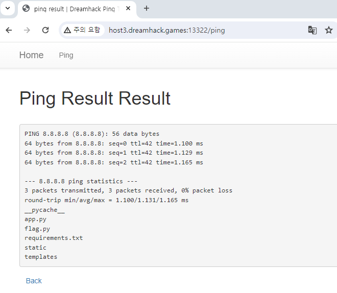 ping -c 3 "8.8.8.8" ; ls # " # 실제 실행되는 명령어
