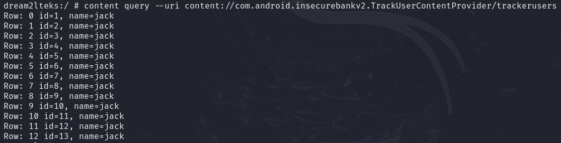 content query --uri content://com.android.insecurebankv2.TrackUserContentProvider/trackerusers