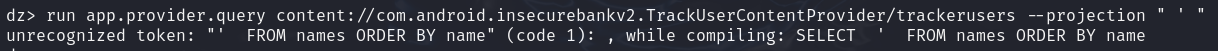 run app.provider.query content://com.android.insecurebankv2.TrackUserContentProvider/trackerusers --projection " ' "